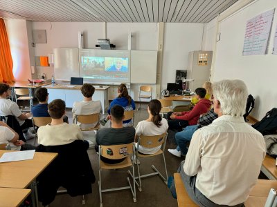 Nachmittags präsentierten die Schülerinnen und Schüler in der Aula ihre Ergebnisse und Erfahrungen, die sie an diesem Tag gemacht haben. Zum Schluss kam der Höhepunkt mit einem selbst geschriebene Song zum Thema Demokratie, der auf der Bühne von einem Rapper und Schülern gerappt wurde.